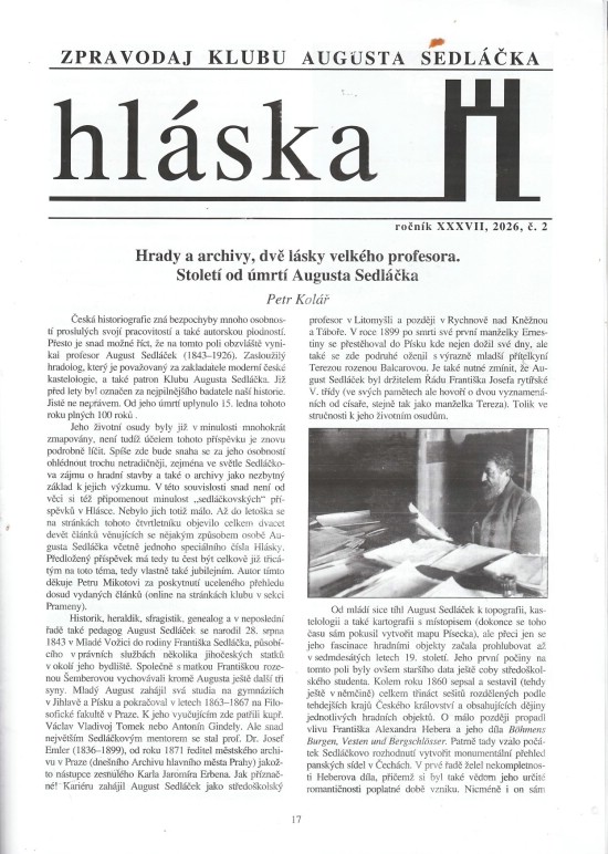 - Hrady a archivy, dvě lásky velkého profesora. Století od úmrtí Augusta Sedláčka. Petr Kolář